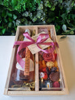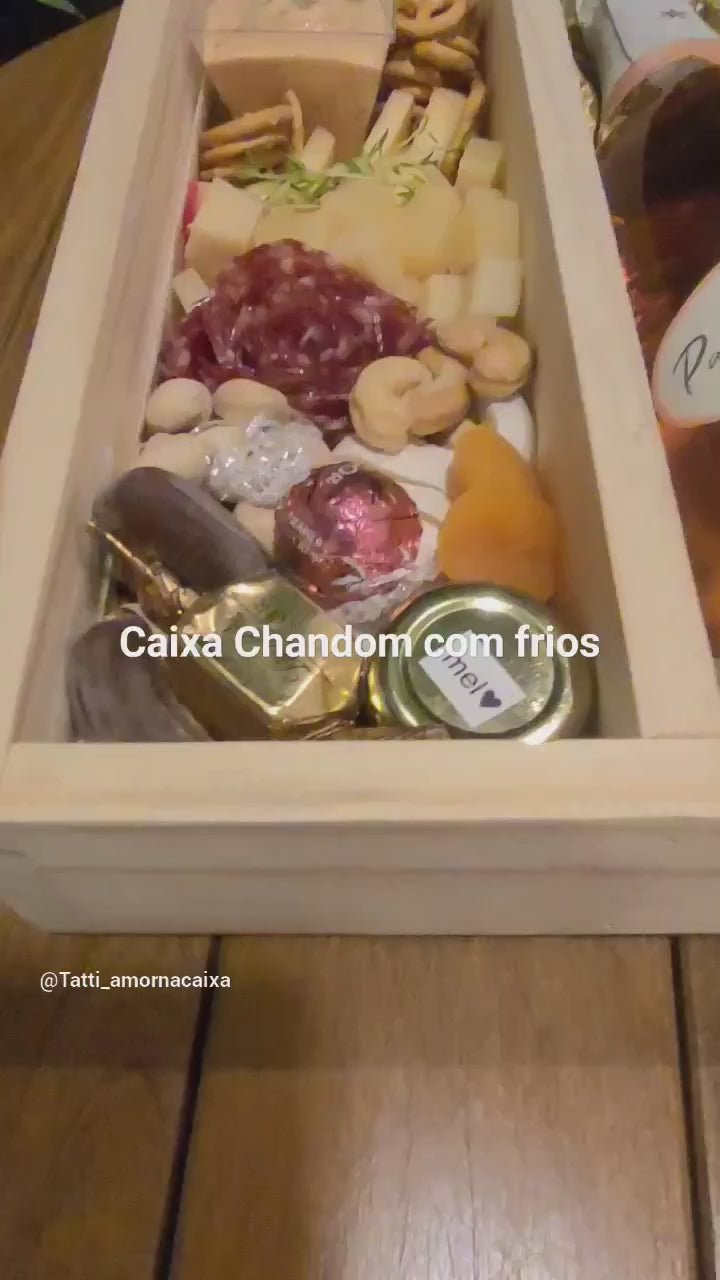 Caixa de madeira pinus 36 x 20cm contendo: 01 garrafa de espumante Chandon 750ml, fatias de pão ciabata, mini pretzels, queijo brie, parmesão e gouda, flor de salame, geleia francesa, mix de nuts, chocolate importado, mel no pote de vidro, mini colher de meleira de bambu;
