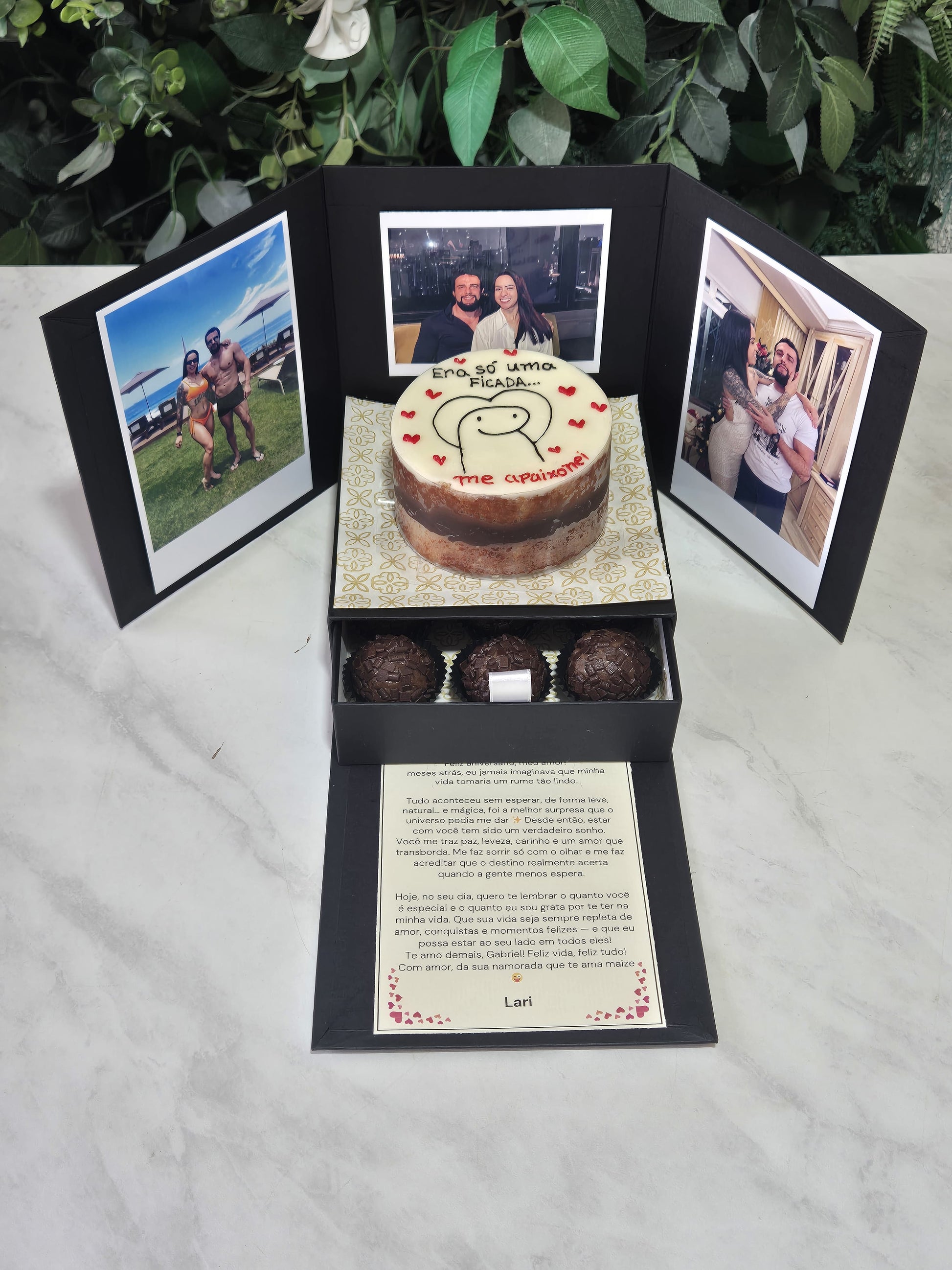 Gaveta Secreta de Brigadeiros – Ao abrir a caixa, uma gaveta deslizante revela deliciosos brigadeiros artesanais, preparados com o equilíbrio perfeito entre cremosidade e sabor. Um toque irresistível de carinho em forma de chocolate!