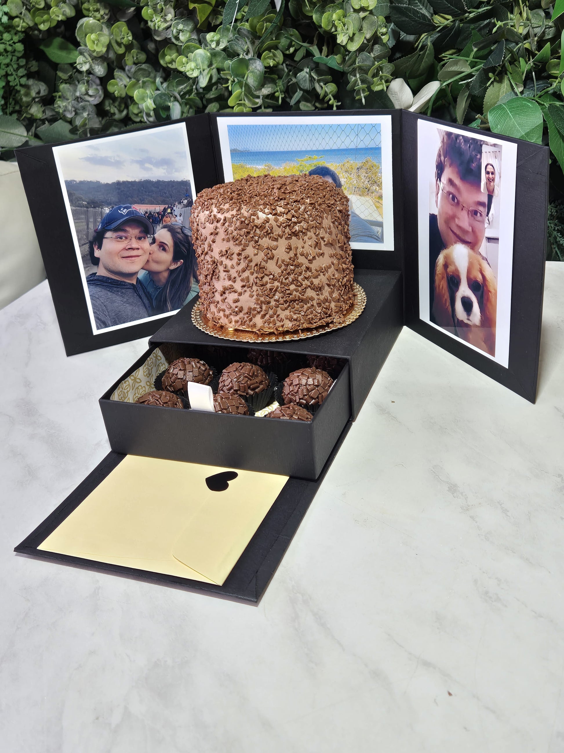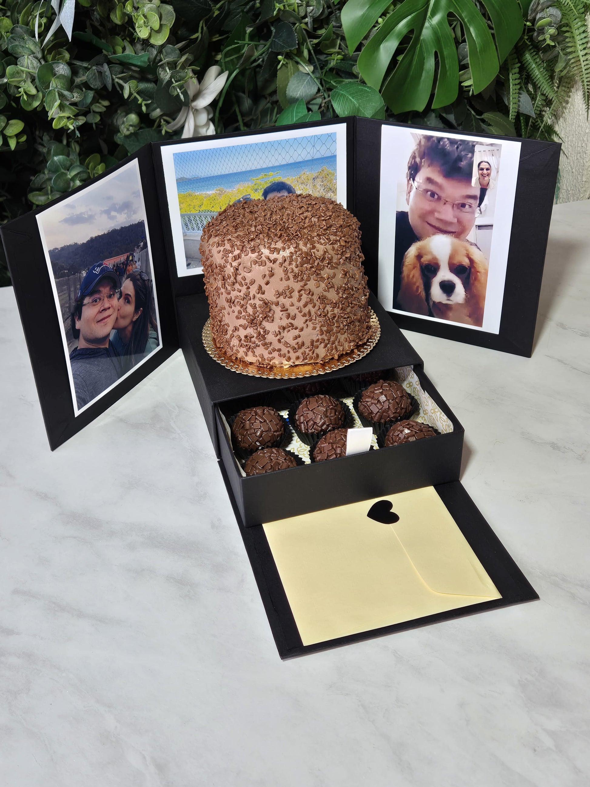 Gaveta Secreta de Brigadeiros – Ao abrir a caixa, uma gaveta deslizante revela deliciosos brigadeiros artesanais, preparados com o equilíbrio perfeito entre cremosidade e sabor. Um toque irresistível de carinho em forma de chocolate!