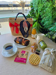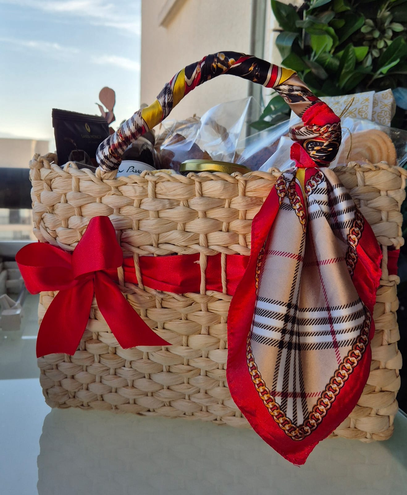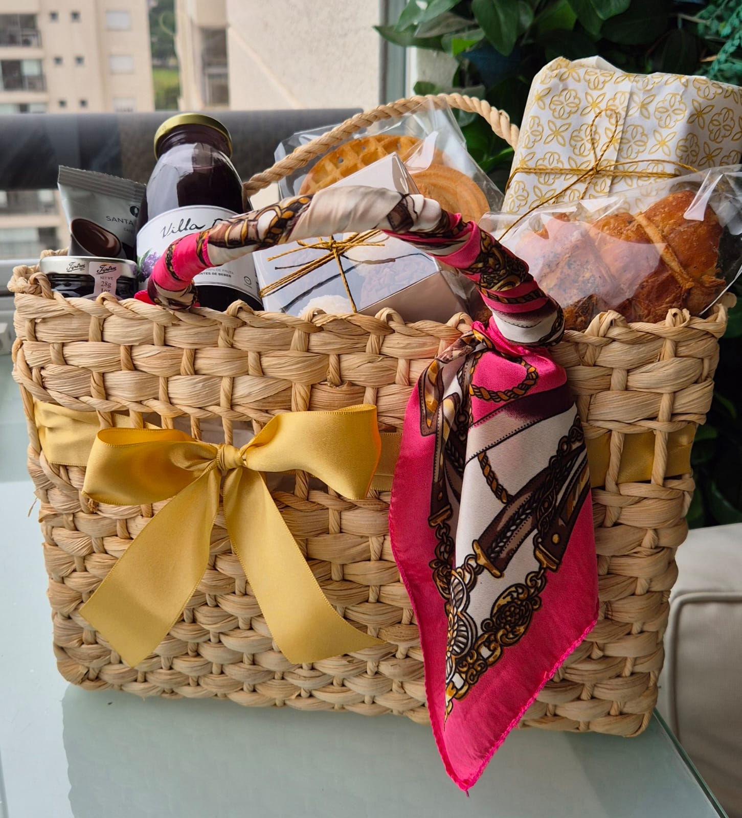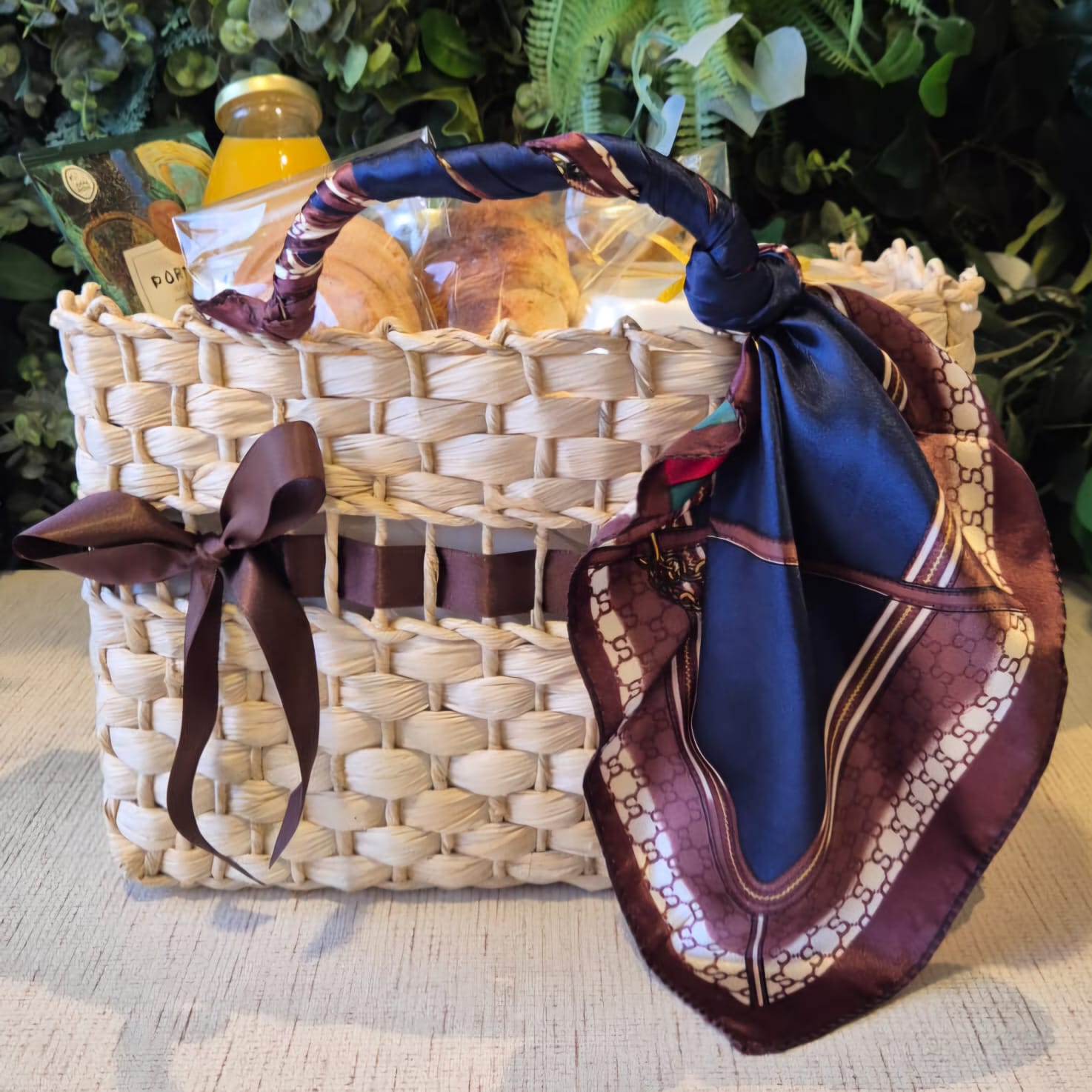 A Cesta ELEGANCE combina o aconchego de um café da manhã artesanal de uma linda bolsa de palha decorada com lenço de cetim, que poderá ser usada depois como acessório de moda, seja no dia a dia, em passeios ou viagens.