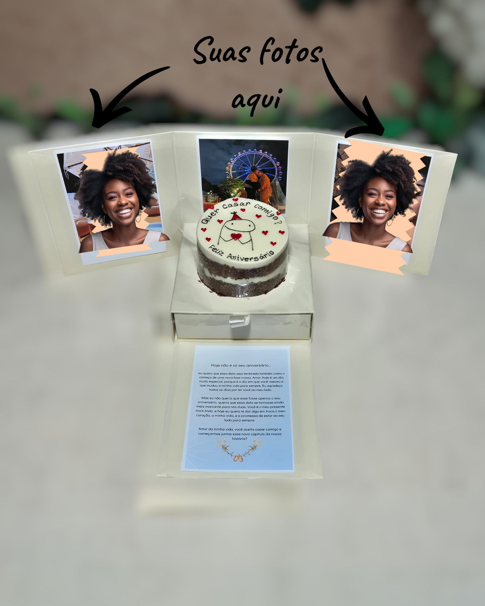 Memórias Guardadas com Amor – No interior da caixa, 3 fotos cuidadosamente fixadas capturam momentos especiais e reforçam laços afetivos. Seja uma recordação de bons tempos ou uma declaração de amor e amizade, essas imagens farão o coração do aniversariante transbordar de emoção. Poderá ser adicionado também um cartão com a mensagem.