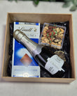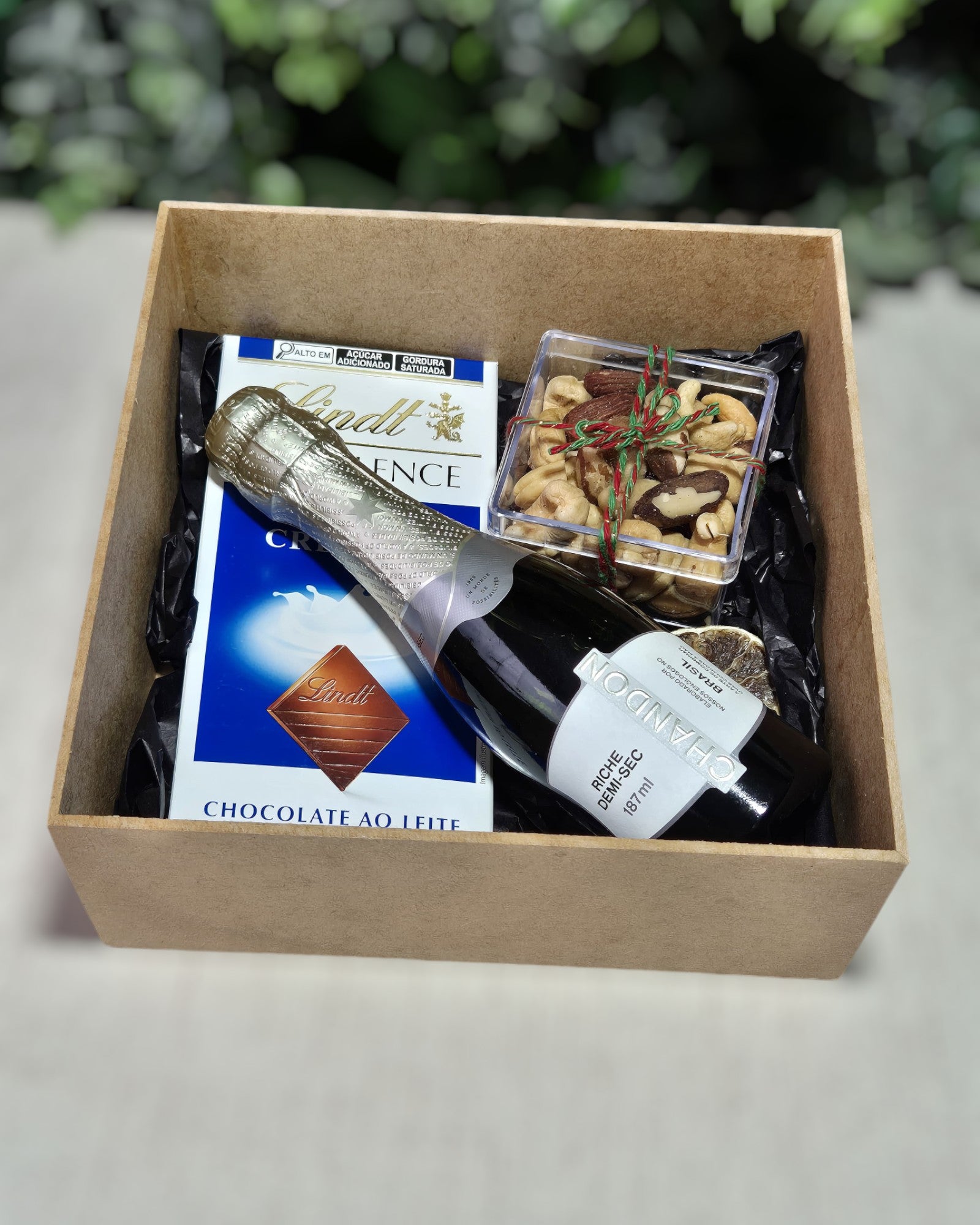 Caixa de Madeira MDF 20x20cm temos nessa proposta um delicioso Chocolate Lindt, uma espumante Baby Chandon 187ml e um pote em acrílico de Nuts com Amêndoas defumadas ou Nozes. Para finalizar, a decoração é feita com papel de seda na base e fechamento com laço de cetim.