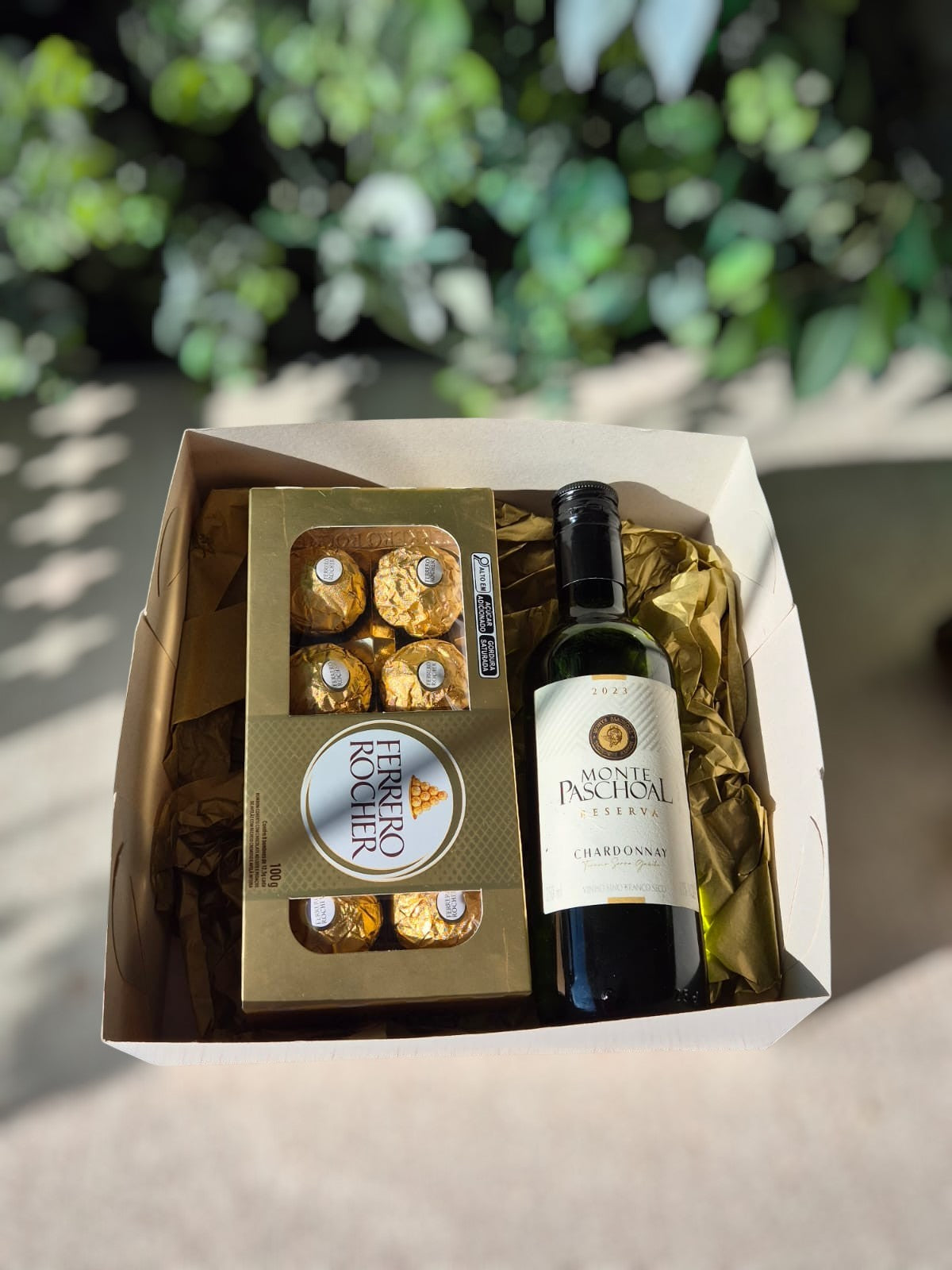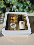 Caixa papelão branca de 20x20 cm contendo 1 mini garrafa de vinho (checar disponibilidade de rótulos), 1 caixa com 8 deliciosos bombons Ferrero Rocher.