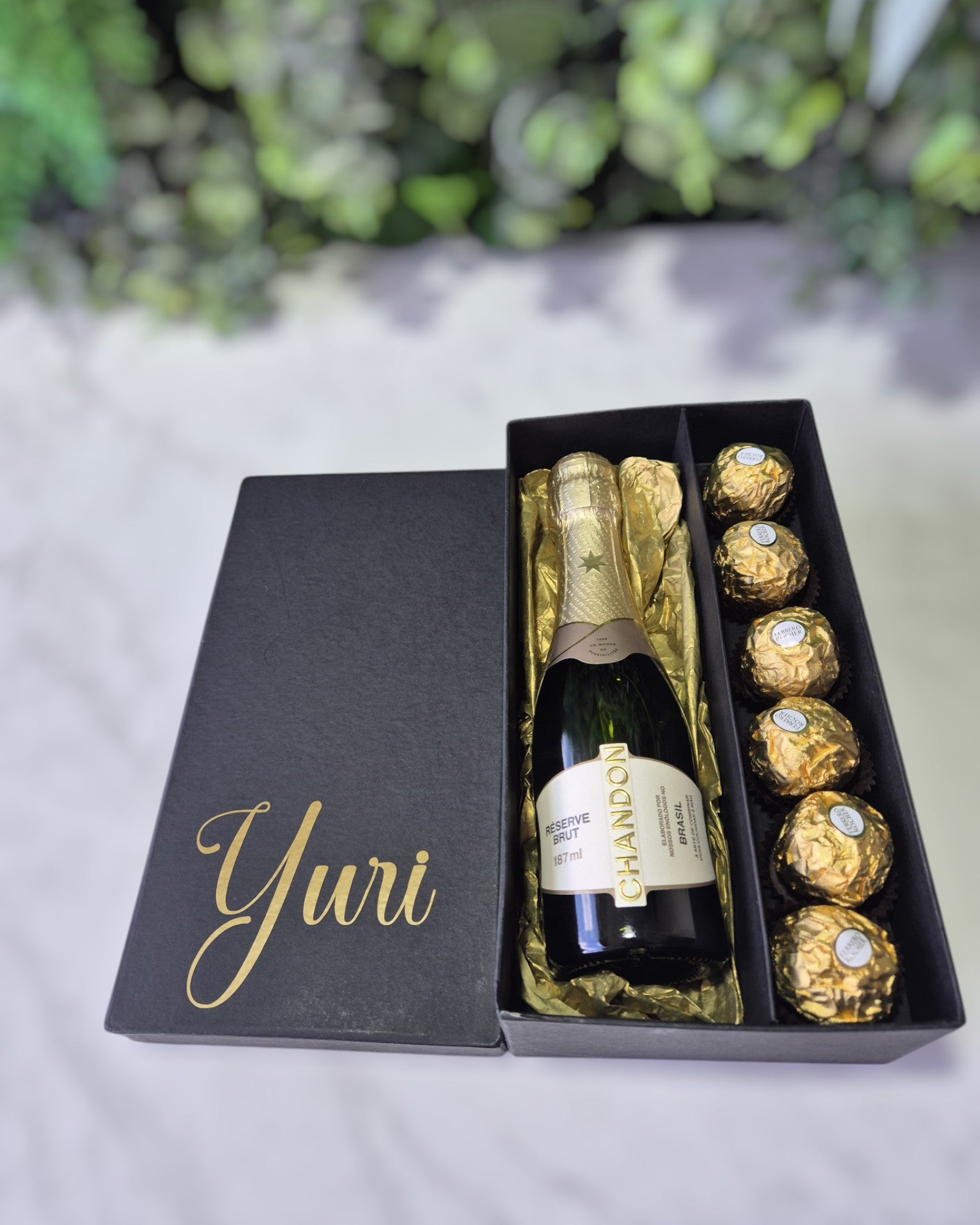 Esta caixinha cartonada apresentada com chocolate de alta qualidade bombons Ferrero Rocher com seu recheio cremoso e crocante é acompanhado por uma garrafinha de Chandon Baby, um espumante exclusivo que traz leveza e elegância.